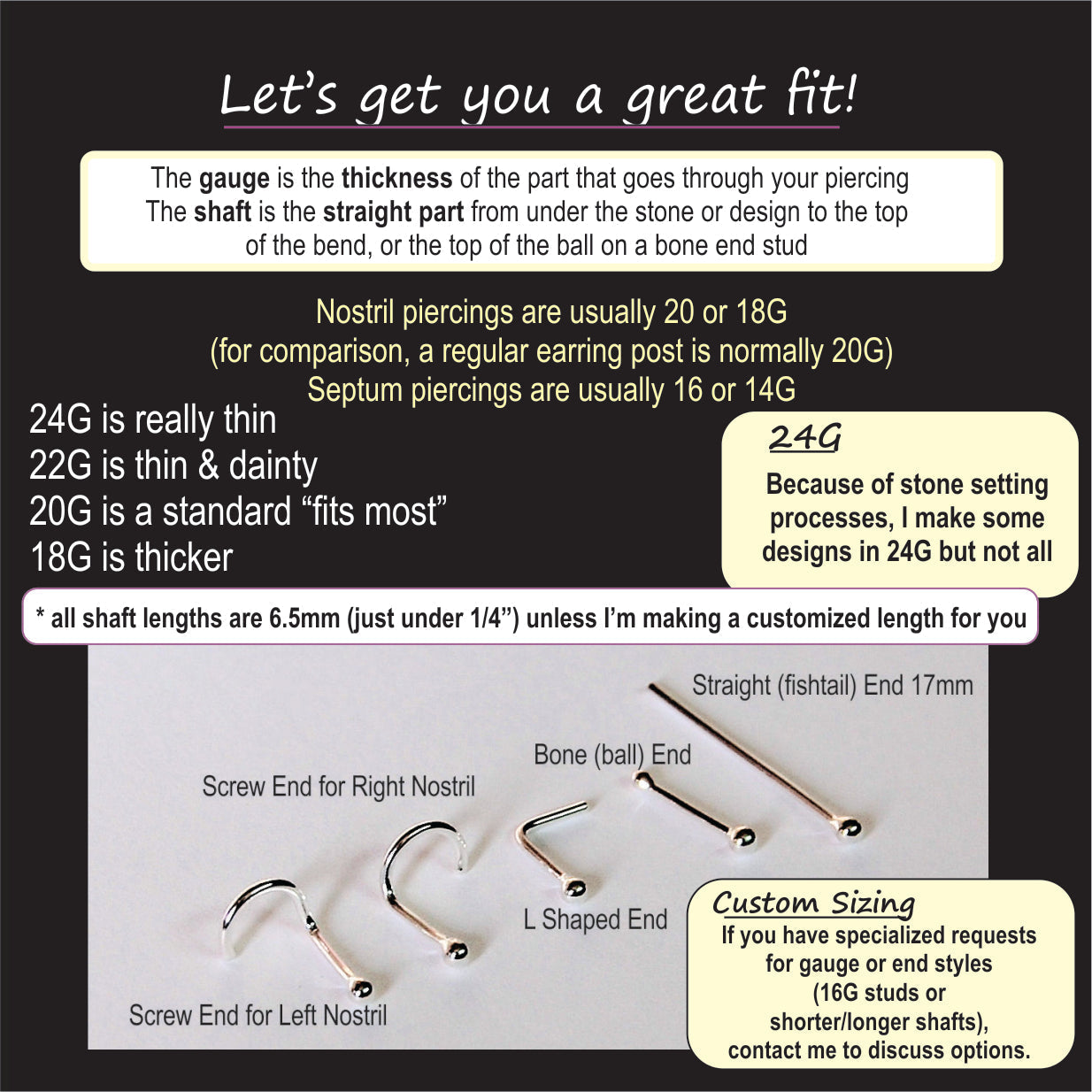 If you have specialized requests for either gauge or end styles – for example 16G nose studs, or longer or shorter shaft lengths for nose studs, please contact me to discuss possible options.