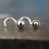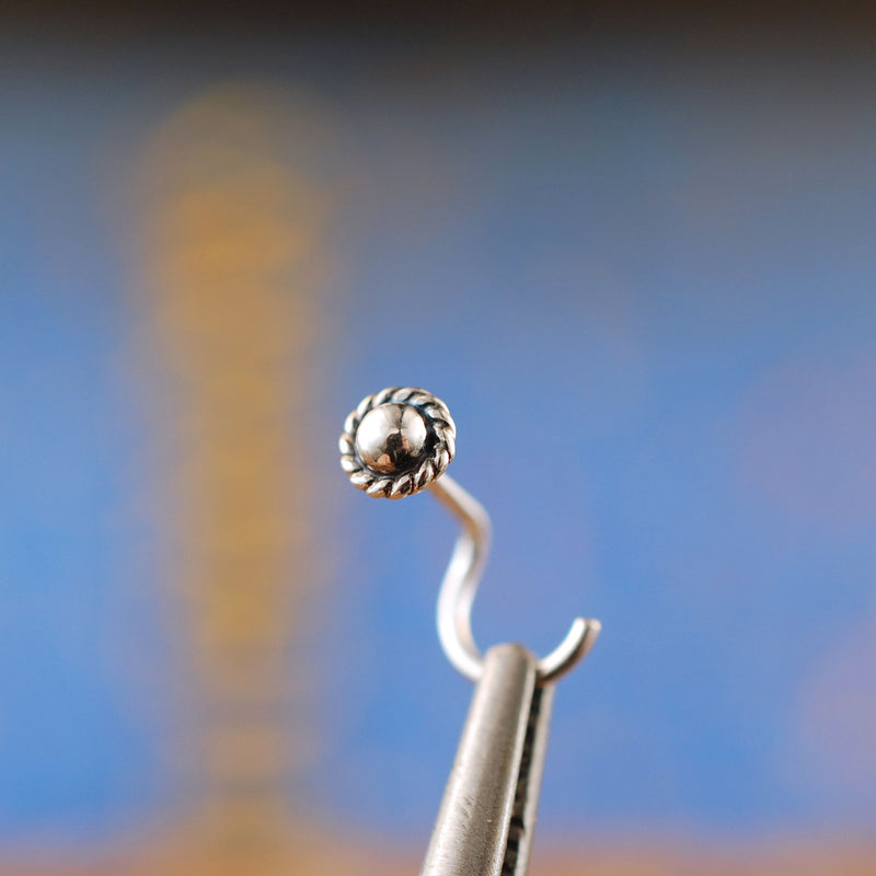 This handcrafted sterling silver nose stud features a sleek mini dome design with a finely braided edge, offering a subtle yet distinctive look. Expertly made to order, its smooth, rounded shape provides comfortable wear while adding a touch of unique elegance to your everyday style.